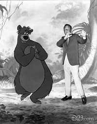 Baloo, based on Kipling’s creation, has appeared in various Disney productions, starting with the company’s 1967 feature-length animated film adaptation of The Jungle Book. In this version, Baloo (voiced by Phil Harris) is portrayed as a friendly, even-tempered character who lives a responsibility-free lifestyle, seemingly far removed from the law teacher in Kipling’s book. Like in the novel, Baloo is one of Mowgli’s mentors and friends. Baloo is also patient and strong; his only apparent weakness is that he’s ticklish. Baloo is initially opposed to bringing Mowgli to the Man Village, wanting to raise him as a son. However, when Bagheera explains that Mowgli is easy prey for Shere Khan the tiger and that he’s not safe in the jungle, even with Baloo’s diligent protection, Baloo realizes he has a point and agrees to tell Mowgli the difficult truth. Mowgli turns on Baloo and runs away, prompting him and Bagheera to split up and search for the boy. Baloo isn’t seen again until the climax of the film, when he sees Mowgli preparing to battle Shere Khan. Baloo attempts to stop the tiger, but almost gets killed in the process. After Mowgli follows a girl into the village and decides to stay there, Baloo is slightly disappointed, but is ultimately relieved that Mowgli is safe at last. He and Bagheera then return to the jungle as they sing a reprise of «The Bare Necessities» together.[4]