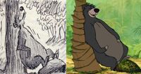 Балу в одной из раскадровок к сцене из первоначального сценария Билла Пита (слева), впоследствии вошедшей в финальную версию мультфильма (справа).