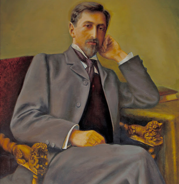 Он с раскрытой головой, сед, старчески благообразен. Поза его напряженно неподвижная и, как у всех слепых, египетская: держится прямо, сдвинув колени, положив на них перевернутый картуз и большие загорелые руки, приподняв своё как бы изваянное лицо и слегка обратив его в сторону, — все время сторожа чутким слухом голоса и шуршащие шаги гуляющих.