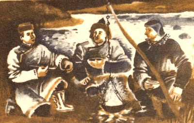 Над селом уже давно опустилась ночь, закончен рабочий день, угомонилась детвора, выпито много зеленого чаю с молоком, а мы все сидим – слушаем и записываем. На лужайку перед юртой сказителя собралось много народу. Годы высушили и слегка ссутулили тоолчу – сказителя. Он поглаживает остренькую реденькую бородку, хлопает длинной трубкой о колено, прочищает ее и продолжает напевать сказку. Увлекаясь и вдохновляясь, он разводит руками, представляет героев в лицах, подчеркивает слова жестами и мимикой.