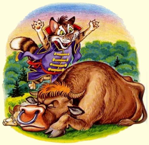 — А у меня Котофей Иваныч очень сердитый. Не дай бог ему досадить! Вы лучше с волком приходите и поклонитесь ему, принесите подарки. Ты принеси ему быка, а волк пускай принесет барана. Но когда принесете, сами отойдите подальше, а то Котофей Иваныч очень сердит!