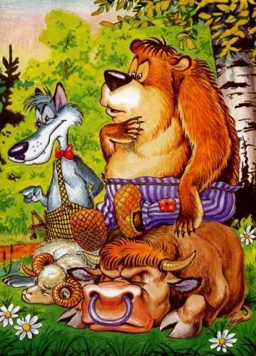 А медведь и волк сошлись и порешили припасти подарки, чтобы к начальнику идти. Медведь поймал быка, а волк барана. И понесли их лисе.
