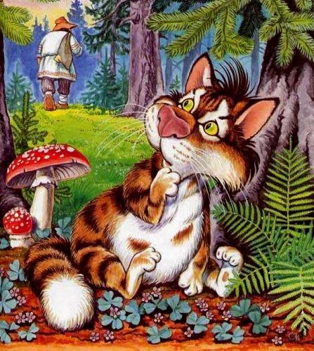Был у мужика кот, да такой проказник — просто беда! Надоел он мужику. Снес его мужик в лес, да там и оставил. Бродил-бродил кот по лесу, а навстречу ему лиса. Увидела она кота и дивуется: «Сколько лет в лесу живу, а этакого зверя не видала». Поклонилась коту и спрашивает: