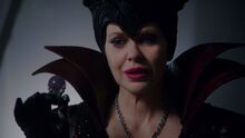 After tricking Regina into letting them stay in Storybrooke, Cruella De Vil and Ursula secretly work with Mr. Gold to resurrect Maleficent. The women steal a totem of Maleficent’s from the pawnshop, which David and Mary Margaret believe will be used to resurrect the dead sorceress. Instead, this is only a ruse to bait the couple into venturing into the cave below the library, where Maleficent’s ashes reside. Once David and Mary Margaret are knocked out by Ursula, Cruella sacrifices some of their blood to Maleficent’s ashes to complete the spell that proceeds to morphs her ashes into her undead form, then her dragon form before restoring her to human. Although Mary Margaret fears she will reveal their past dealings to Emma, Maleficent affirms she only cares about relishing in their suffering, which will be as long and as unyielding as her own had been. Departing with Cruella and Ursula, she later goes with them to a hill top overlooking the town. Maleficent summons the totem into her palm, connecting it with an ornament from her necklace to form a baby rattle, which she shakes as a pained look crosses her face.