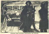 «…подошел к нему, дрожа от гнева. «Чего тебе надобно? — сказал он ему, стиснув зубы, — что ты за мною всюду крадешься, как разбойник? или хочешь меня зарезать? Пошел вон!» — и, сильной рукою схватив старика за ворот, вытолкнул его на лестницу.»