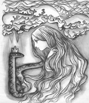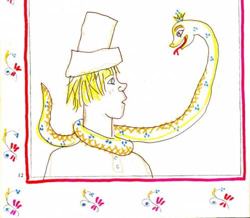 Тотчас красная девица оборотилась змеёю, влезла на пику, скользнула казаку на шею, обвилась вокруг шеи три раза и взяла свой хвост в зубы. Казак испугался, а змея заговорила человеческим голосом: