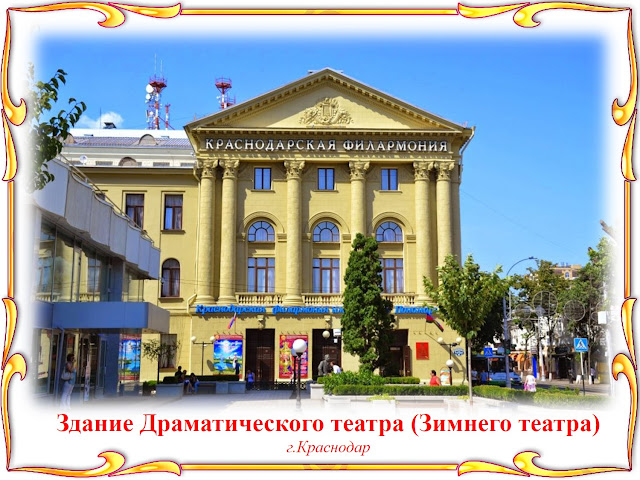 Здание Драматического театра (Зимнего театра). Краснодарский академический театр драмы им. Горького образован 29 апреля 1920 года. Этому событию способствовало завершение строительства в Екатеринодаре в 1909 году нового театрального здания, на углу улиц Красной и Гоголя. Тогда он получил название Зимний театр. Образование Зимнего театра положило начало всей театральной жизни Екатеринодара — Краснодара.
