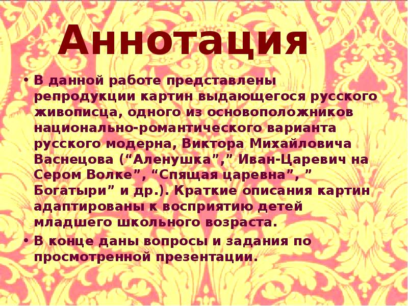 Презентация «Сказочная живопись художника В.М.Васнецова»