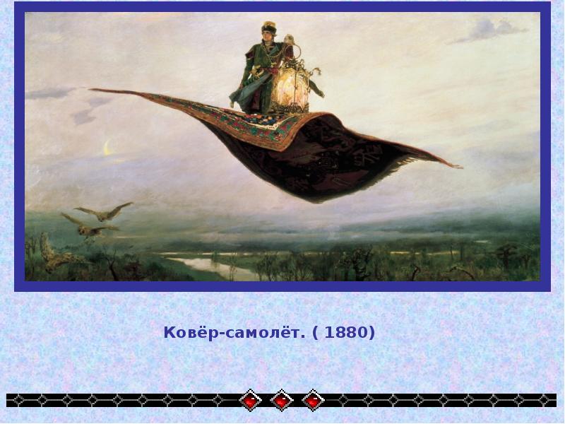 • В картине “Ковер-самолет” Васнецов изобразил героя русских сказок — Иванушку, свободно летящим над просторами родины. Сказочная Жар-плица — символ могущества и счастья человека — находится в его власти, в его руках. Нежный и тонкий образ народной фантазии получил в картине художника проникновенное, поэтическое изобразительное решение. Гордый молодец с ковра-самолета смотрит на расстилающиеся внизу просторы русской земли. Неброская северная природа послужила художнику фоном для картины. Сверкают реки, озера, темной стеной стоит лес, сопровождают ковер огромные птицы. Ярким огнем горит в клетке пойманная героем Жар- птица. О мудрости, силе, ловкости народной рассказывает это полотно.