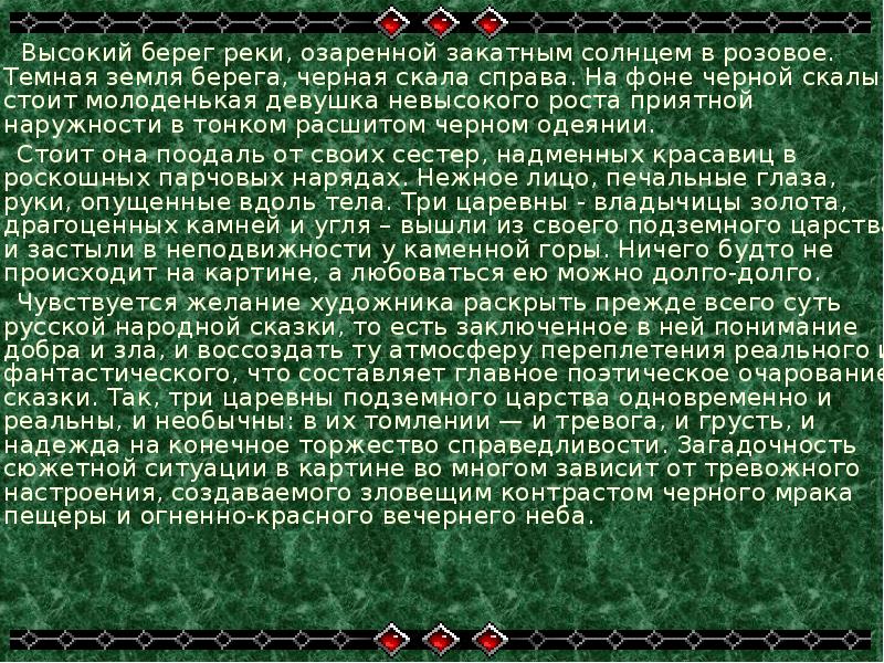 Чувствуется желание художника раскрыть прежде всего суть русской народной сказки, то есть заключенное в ней понимание добра и зла, и воссоздать ту атмосферу переплетения реального и фантастического, что составляет главное поэтическое очарование сказки. Так, три царевны подземного царства одновременно и реальны, и необычны: в их томлении — и тревога, и грусть, и надежда на конечное торжество справедливости. Загадочность сюжетной ситуации в картине во многом зависит от тревожного настроения, создаваемого зловещим контрастом черного мрака пещеры и огненно-красного вечернего неба. -