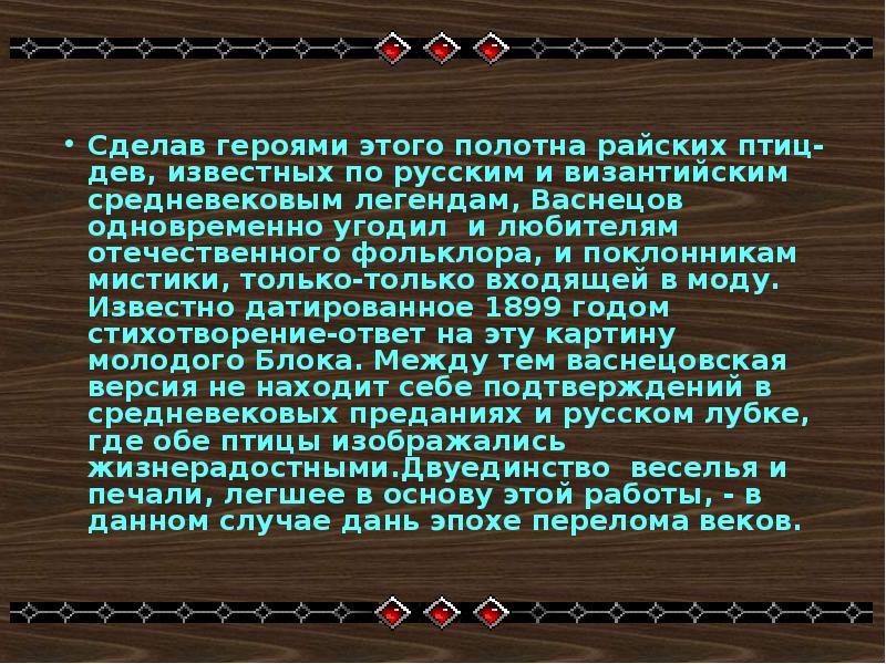 Используя литературу, русский эпос, В. М. Васнецов сумел создать настоящий шедевр художественного искусства. -