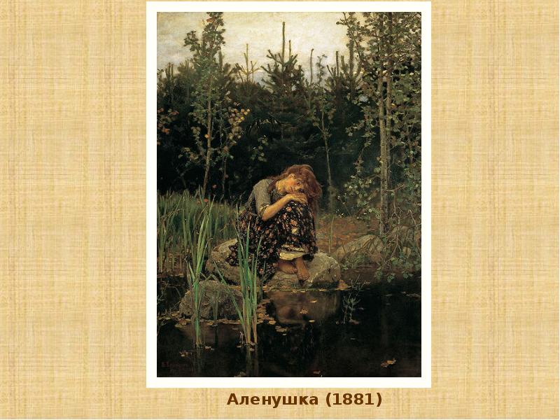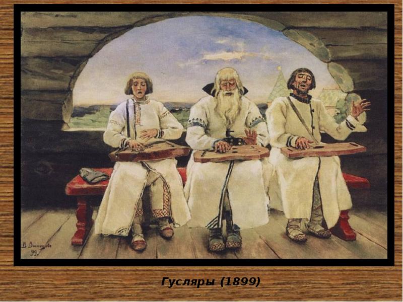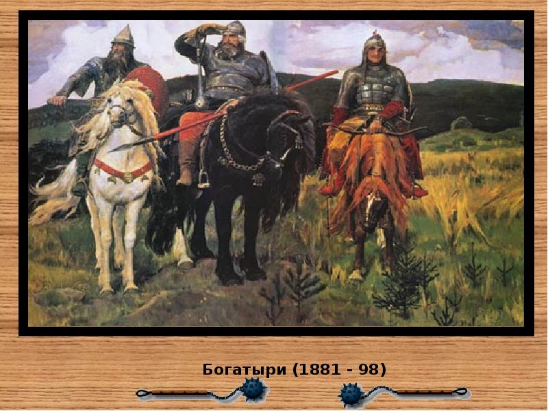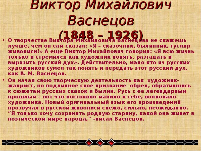 Виктор Михайлович Васнецов (1848 – 1926) • О творчестве Виктора Михайловича Васнецова не скажешь лучше, чем он сам сказал: «Я – сказочник, былинник, гусляр живописи!» А еще Виктор Михайлович говорил: «Я всю жизнь только и стремился как художник понять, разгадать и выразить русский дух» . Действительно, мало кто из русских художников сумел так понять и передать этот русский дух, как В. М. Васнецов. • Он начал свою творческую деятельность как художник-жанрист, но подлинное свое призвание обрел, обратившись к сюжетам русских сказок и былин. Русь с ее легендарным прошлым – вот что постоянно манило к себе, волновало художника. Новый оригинальный язык его произведений прозвучал в русской живописи свежо, сильно, неожиданно. ”Я только хочу сохранить родную старину, какой она живет в поэтическом мире народа, ” -писал Васнецов.