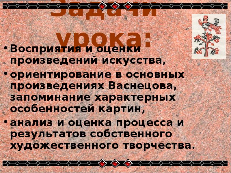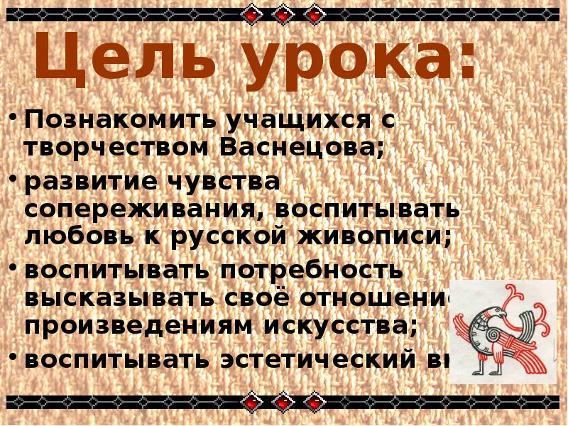 Познакомить учащихся с творчеством Васнецова;