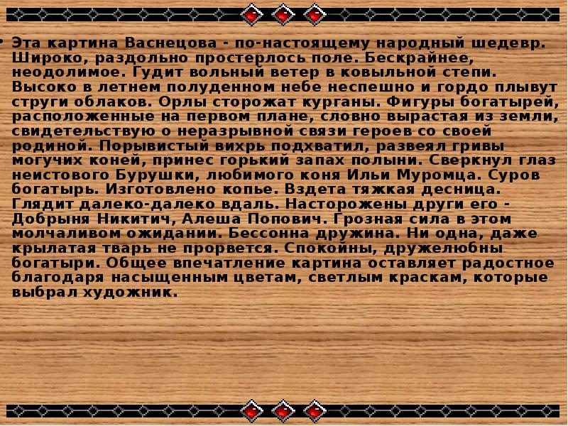 • Эта картина Васнецова — по-настоящему народный шедевр. Широко, раздольно простерлось поле. Бескрайнее, неодолимое. Гудит вольный ветер в ковыльной степи. Высоко в летнем полуденном небе неспешно и гордо плывут струги облаков. Орлы сторожат курганы. Фигуры богатырей, расположенные на первом плане, словно вырастая из земли, свидетельствую о неразрывной связи героев со своей родиной. Порывистый вихрь подхватил, развеял гривы могучих коней, принес горький запах полыни. Сверкнул глаз неистового Бурушки, любимого коня Ильи Муромца. Суров богатырь. Изготовлено копье. Вздета тяжкая десница. Глядит далеко-далеко вдаль. Насторожены други его — Добрыня Никитич, Алеша Попович. Грозная сила в этом молчаливом ожидании. Бессонна дружина. Ни одна, даже крылатая тварь не прорвется. Спокойны, дружелюбны богатыри. Общее впечатление картина оставляет радостное благодаря насыщенным цветам, светлым краскам, которые выбрал художник.