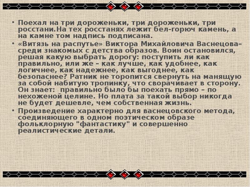 Поехал на три дороженьки, три дороженьки, три росстани.На тех росстанях лежит бел-горюч камень, а на камне том надпись подписана.
