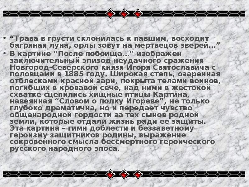 В картине “После побоища…” изображен заключительный эпизод неудачного сражения Новгород-Северского князя Игоря Святославича с половцами в 1885 году. Широкая степь, озаренная отблесками красной зари, покрыта телами воинов, погибших в кровавой сече, над ними в жестокой схватке сцепились хищные птицы Картина, навеянная “Словом о полку Игореве”, не только глубоко драматична, но и передает чувство общенародной гордости за тех сынов родной земли, которые отдали жизнь ради ее защиты. Эта картина – гимн доблести и беззаветному героизму защитников родины, выражение сокровенного смысла бессмертного героического русского народного эпоса. -
