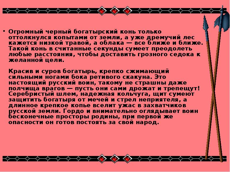 Красив и суров богатырь, крепко сжимающий сильными ногами бока ретивого скакуна. Это настоящий русский воин, такому не страшны даже полчища врагов — пусть они сами дрожат и трепещут! Серебристый шлем, надежная кольчуга, щит сумеют защитить богатыря от мечей и стрел неприятеля, а длинное крепкое копье вселит ужас в захватчиков русской земли. Гордо и внимательно оглядывает воин бесконечные просторы родины, при первой же опасности он готов постоять за свой народ.