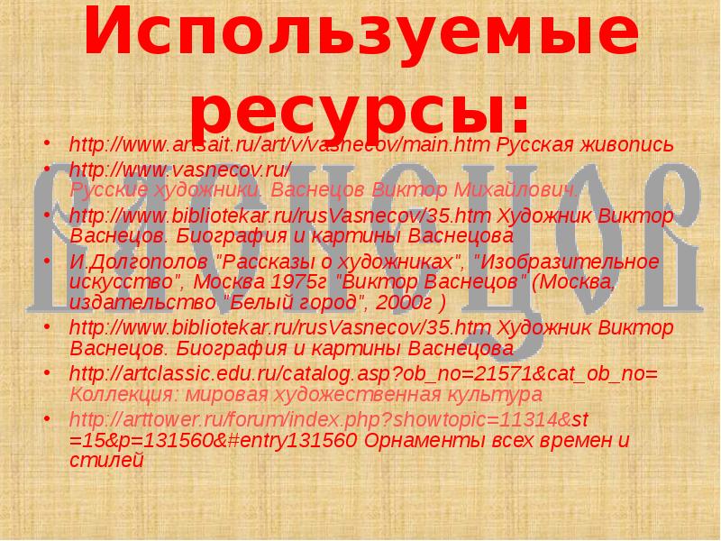 http://www.bibliotekar.ru/rusVasnecov/35.htm Художник Виктор Васнецов. Биография и картины Васнецова