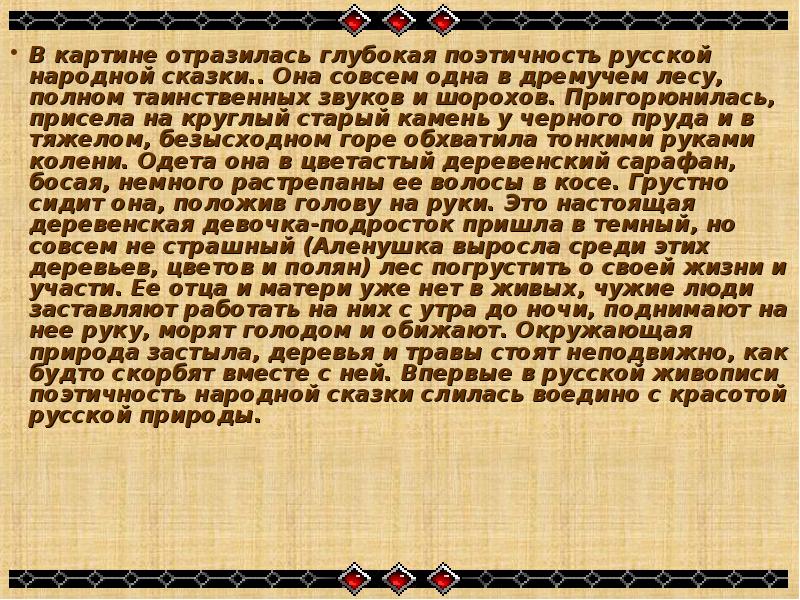 Произведение характерно для васнецовского метода, соединяющего в одном поэтическом образе фольклорную «фантастику» и совершенно реалистические детали. -