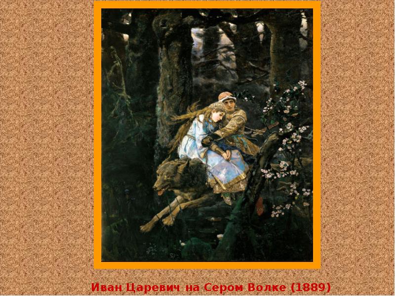 2.Картина-сказка, картина-фантазия – соединение несоединимого, здесь и дремучий лес, и цветущая яблоня. Иван одет по — боярски, царевна в дорогих парчовых одеждах, унизанных жемчугом.