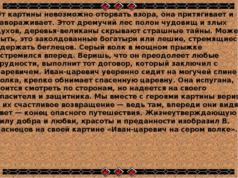 От картины невозможно оторвать взора, она притягивает и завораживает. Этот дремучий лес полон чудовищ и злых духов, деревья-великаны скрывают страшные тайны. Может быть, это заколдованные богатыри или лешие, стремящиеся удержать беглецов. Серый волк в мощном прыжке устремился вперед. Веришь, что он преодолеет любые трудности, выполнит тот договор, который заключил с царевичем. Иван-царевич уверенно сидит на могучей спине волка, крепко обнимает спасенную царевну. Она испугана, боится смотреть по сторонам, но надеется на своего спасителя и защитника. Мы вместе с героями картины верим в их счастливое возвращение — ведь там, впереди они видят свет — конец опасного путешествия. Жизнеутверждающую силу добра и любви, красоты и преданности изобразил В. Васнецов на своей картине «Иван-царевич на сером волке».