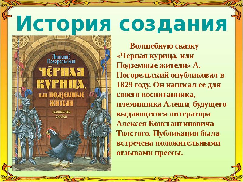 История создания Волшебную сказку «Черная курица, или Подземные жители» А. Погорельский опубликовал в 1829 году. Он написал ее для своего воспитанника, племянника Алеши, будущего выдающегося литератора Алексея Константиновича Толстого. Публикация была встречена положительными отзывами прессы. Волшебную сказку «Черная курица, или Подземные жители» А. Погорельский опубликовал в 1829 году. Он написал ее для своего воспитанника, племянника Алеши, будущего выдающегося литератора Алексея Константиновича Толстого. Публикация была встречена положительными отзывами прессы.