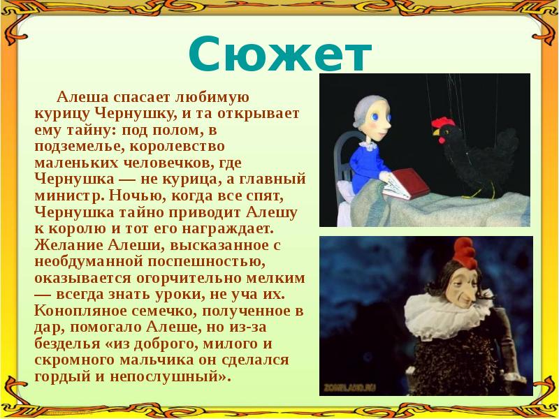 - Алеша спасает любимую курицу Чернушку, и та открывает ему тайну: под полом, в подземелье, королевство маленьких человечков, где Чернушка — не курица, а главный министр. Ночью, когда все спят, Чернушка тайно приводит Алешу к королю и тот его награждает. Желание Алеши, высказанное с необдуманной поспешностью, оказывается огорчительно мелким — всегда знать уроки, не уча их. Конопляное семечко, полученное в дар, помогало Алеше, но из-за безделья «из доброго, милого и скромного мальчика он сделался гордый и непослушный».