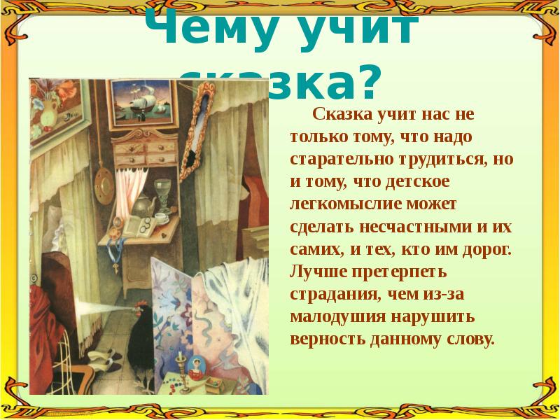 - Сказка учит нас не только тому, что надо старательно трудиться, но и тому, что детское легкомыслие может сделать несчастными и их самих, и тех, кто им дорог. Лучше претерпеть страдания, чем из-за малодушия нарушить верность данному слову.