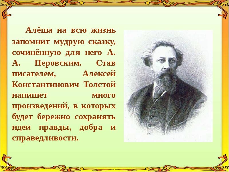 - Алёша на всю жизнь запомнит мудрую сказку, сочинённую для него А. А. Перовским. Став писателем, Алексей Константинович Толстой напишет много произведений, в которых будет бережно сохранять идеи правды, добра и справедливости.