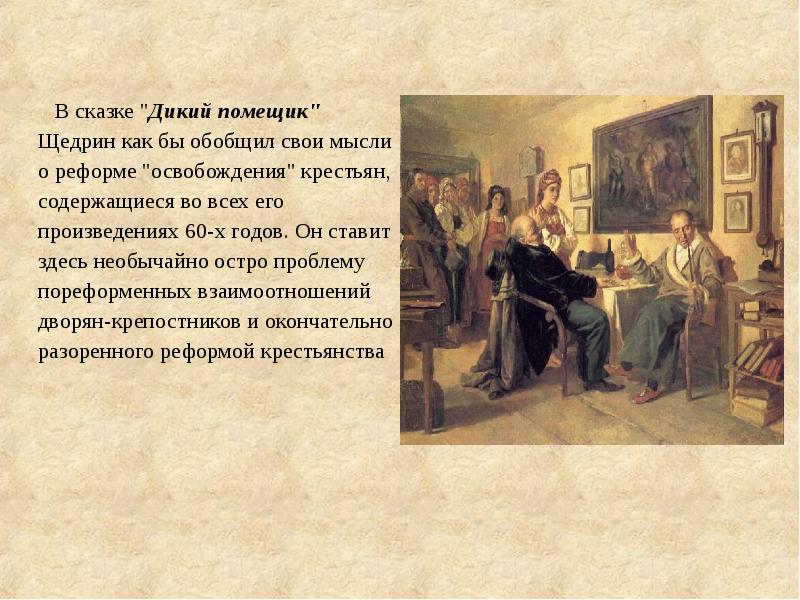 В сказке «Дикий помещик» Щедрин как бы обобщил свои мысли о реформе «освобождения» крестьян, содержащиеся во всех его произведениях 60-х годов. Он ставит здесь необычайно остро проблему пореформенных взаимоотношений дворян-крепостников и окончательно разоренного реформой крестьянства