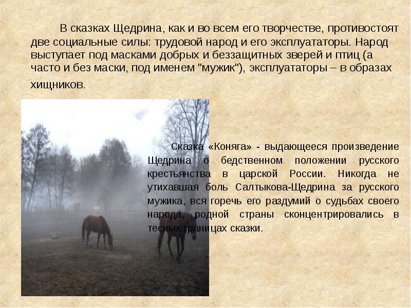 В сказках Щедрина, как и во всем его творчестве, противостоят две социальные силы: трудовой народ и его эксплуататоры. Народ выступает под масками добрых и беззащитных зверей и птиц (а часто и без маски, под именем «мужик»), эксплуататоры – в образах хищников.