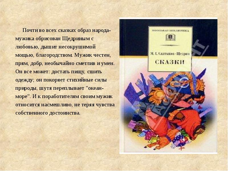 Почти во всех сказках образ народа-мужика обрисован Щедриным с любовью, дышит несокрушимой мощью, благородством. Мужик честен, прям, добр, необычайно сметлив и умен. Он все может: достать пищу, сшить одежду; он покоряет стихийные силы природы, шутя переплывает «океан-море». И к поработителям своим мужик относится насмешливо, не теряя чувства собственного достоинства.