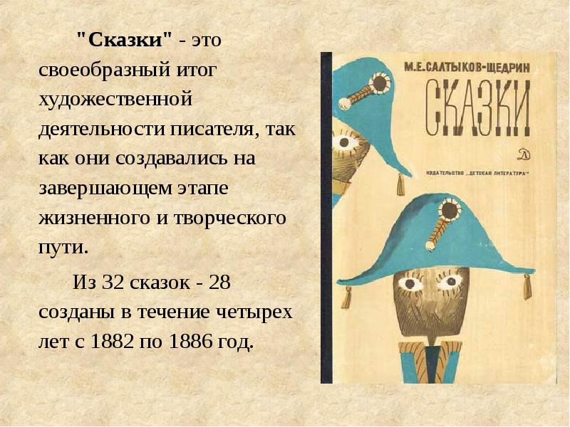 «Сказки» – это своеобразный итог художественной деятельности писателя: они создавались на завершающем этапе жизненного и творческого пути. Из 32 сказок 28 созданы в течение четырех лет, с 1882 по 1886 год. -