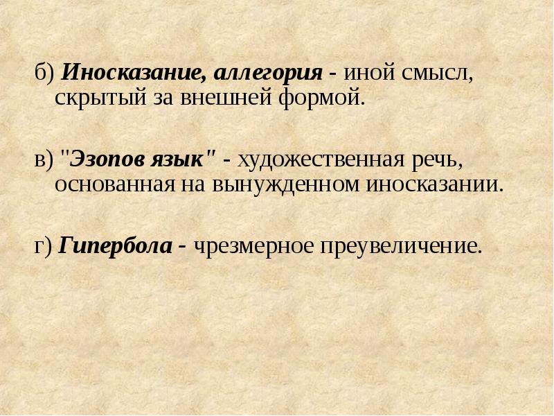 б) Иносказание, аллегория — иной смысл, скрытый за внешней формой.
