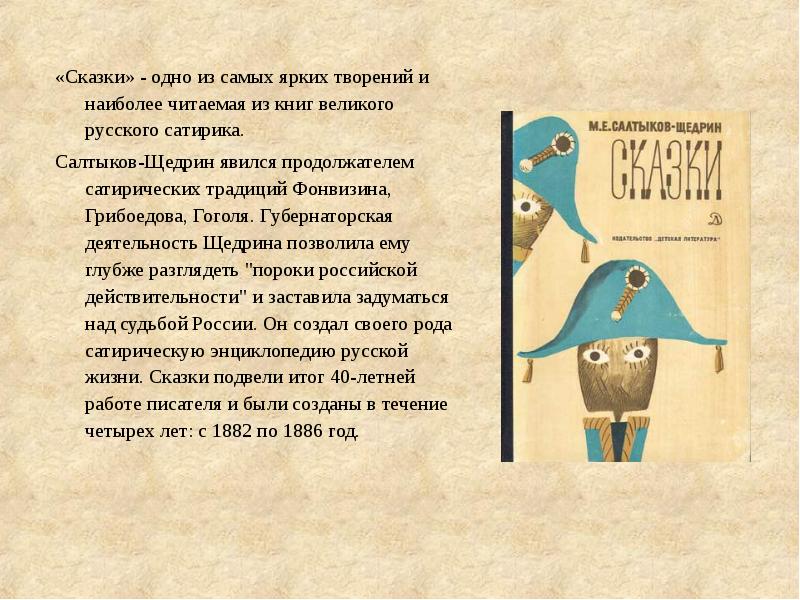Салтыков-Щедрин явился продолжателем сатирических традиций Фонвизина, Грибоедова, Гоголя. Губернаторская деятельность Щедрина позволила ему глубже разглядеть «пороки российской действительности» и заставила задуматься над судьбой России. Он создал своего рода сатирическую энциклопедию русской жизни. Сказки подвели итог 40-летней работе писателя и были созданы в течение четырех лет: с 1882 по 1886 год.