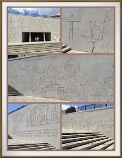 От площади Стоявших насмерть к площади Героев опять ведут ступени. По бокам от них стоят стены-руины с объемными композициями, изображающими защитников Родины.