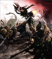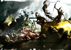 Аналогично ситуация обстоит и с ковенами гемункулов, которые порой отправляются на войну по собственному желанию. И хотя основную часть времени гемункулы, словно жирные пауки, не вылезают из своей паутины теней и боли, им необходим постоянный приток жертв точно так же, как и любым другим представителям общества комморритов. Многие из тех гемункулов, что прозорливее остальных, предпочитают собственноручно дирижировать подопечными в ходе налёта, намётанным глазом выискивая тех, кто им нужен, или наслаждаясь потворством своим странным прихотям. Ковен на войне — это устрашающее зрелище: бушующий поток скрюченных костей и вздутых жилистых мышц, переливающийся мириадом клинков и игл. Гротески врываются во вражеские ряды вместе с жужжащими и трескучими машинами боли, в то время как жуткие орудия гемункулов самым впечатляющим образом терзают, рвут и разлагают неприятеля.