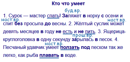 Сурок — мастер спать! Заляжет (буд. вр.) в норку с осени и спит (наст. вр.) без просыпа до весны. Жёлтый суслик может (наст. вр.) девять месяцев в году не есть и не пить. Ящерица-круглоголовка в одну секунду зарылась (прош.вр.) в песок. Песчаный удавчик умеет (наст. вр.) ползать под песком так же легко, как рыба плавать в воде.