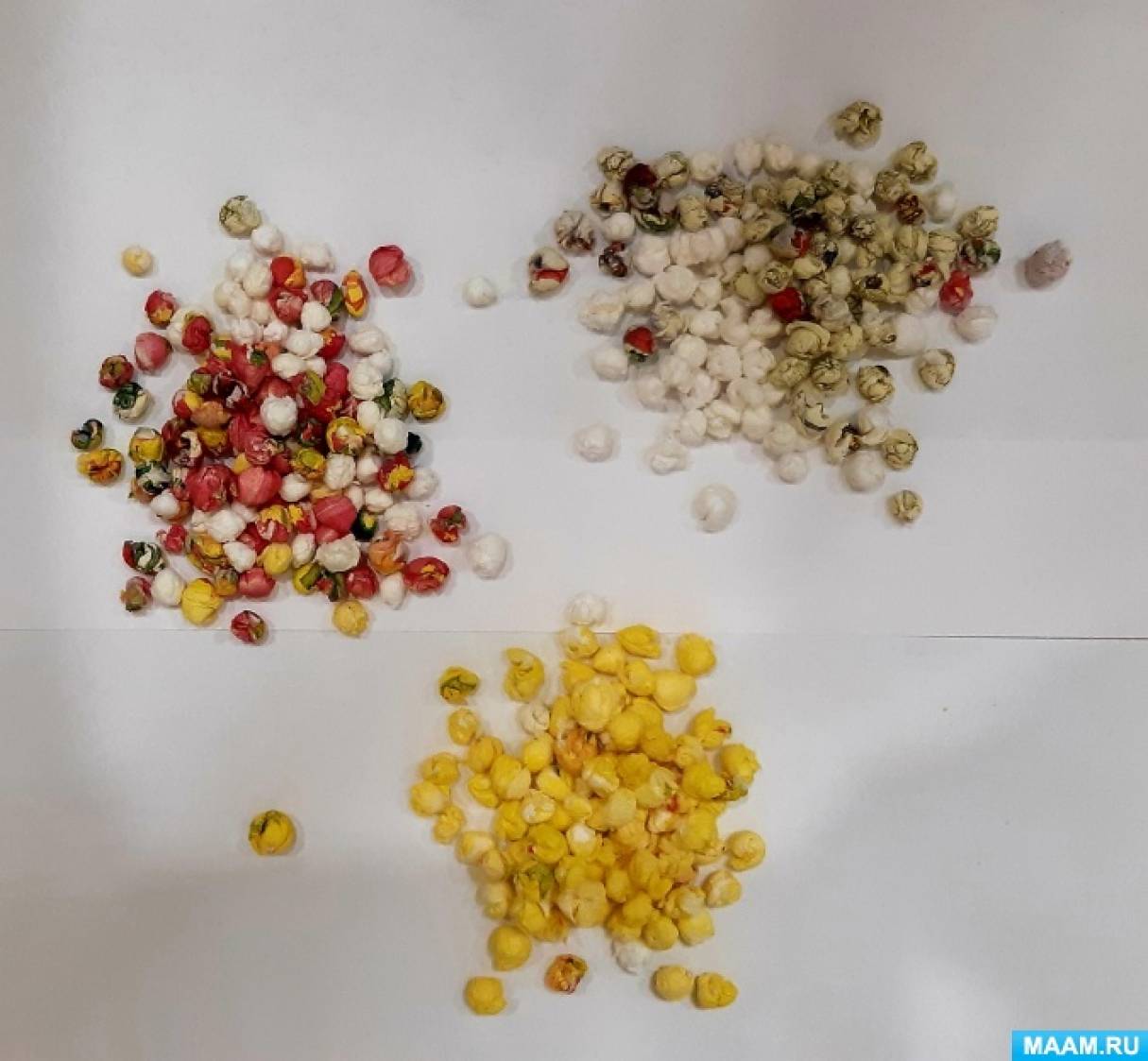 Пока наклеенный петушок сохнет, нужно скатать шарики из цветных салфеток. Салфетки можно разрезать или разорвать на 9-12-16 квадратиков, скручиваем квадратики в тугие шарики, можно немного смочить пальцы водой, тогда комочки получаются более маленькими и тугими.