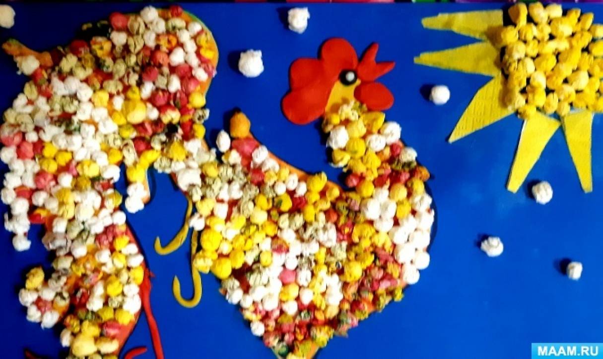 Уважаемые коллеги, сегодня вашему вниманию, хочу предложить мастер-класс по созданию картины «Золотой Петушок», изготовленная из «волшебных комочков» — одной из разновидностей салфеточной аппликации с элементами пластилинографии. Творчество великого гения заслуживает внимание людей всех возрастов, пополнить выставку еще одной яркой, творческой работой детей, «Золотым Петушком», который своим пением защищал город, будет только плюсом.